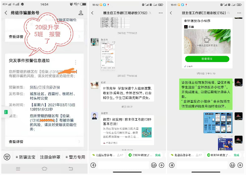 同时,三明农校积极推进预防电信诈骗工作,和沙县公安局凤岗派出所合作,推广“金钟罩”反诈骗预警系统。该系统初见成效,综治副校长侯铨贵警官成功地劝阻多起电信诈骗。