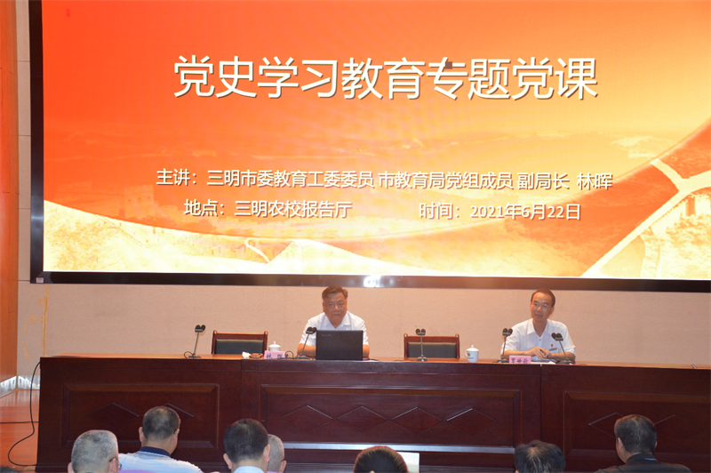 6月22日下午,中共三明市委教育工委委员、三明市教育局党组成员、副局长林晖来三明农校上党课。三明农校全体党员领导干部和部分教职员工到场聆听,党课由三明农校党委书记、校长罗世钦主持。