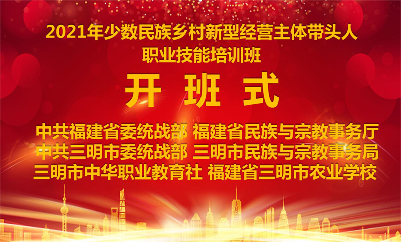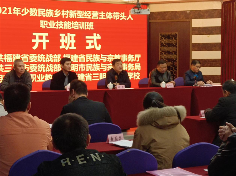 本次培训班由中共福建省委统战部、福建省民族与宗教事务厅主办,中共三明市委统战部、三明市民族与宗教事务局承办,三明市中华职业教育社、三明市农业学校协办。开班式由市民族宗教局副局长赖德农主持,省民族宗教厅二级巡视员钟声作主旨讲话,参加开班式的还有省民族宗教厅陈锦云处长、市委统战部一级调研员曹观生、三明农校谢阳军副校长等同志。