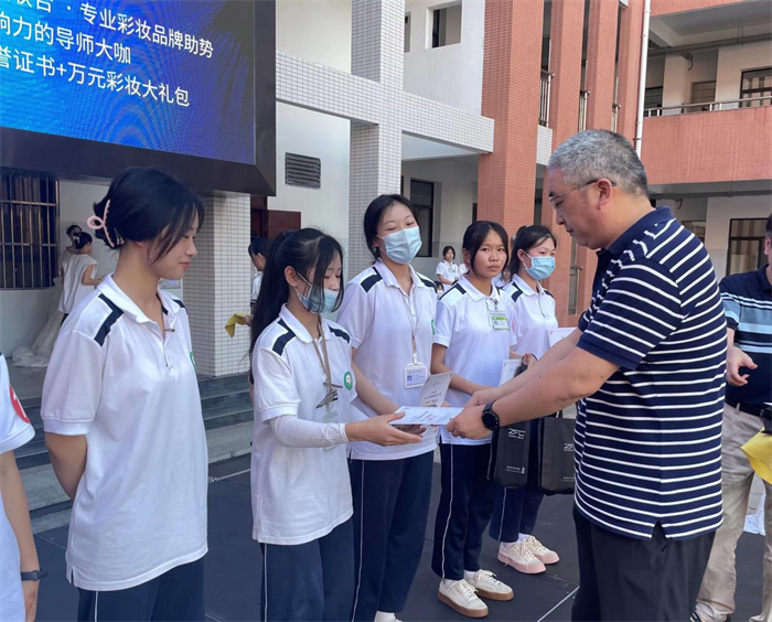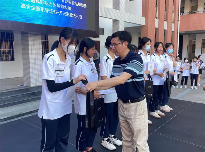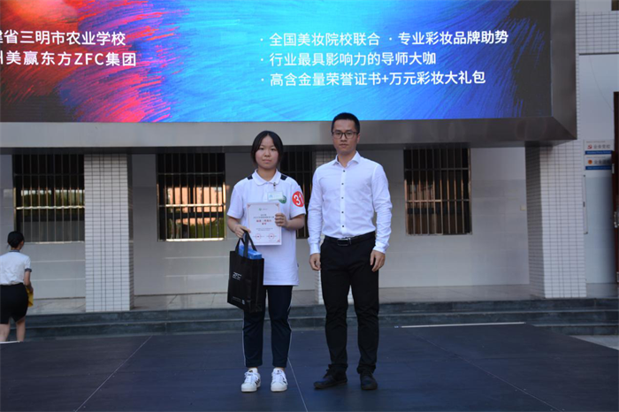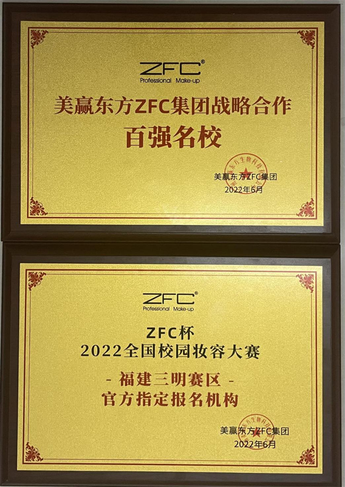赛前,美赢东方ZFC集团代表陈祥远向我校授予“美赢东方ZFC集团战略合作百强名校”、“ZFC杯2022全国校园妆容大赛福建三明赛区官方指定报名机构”牌匾。