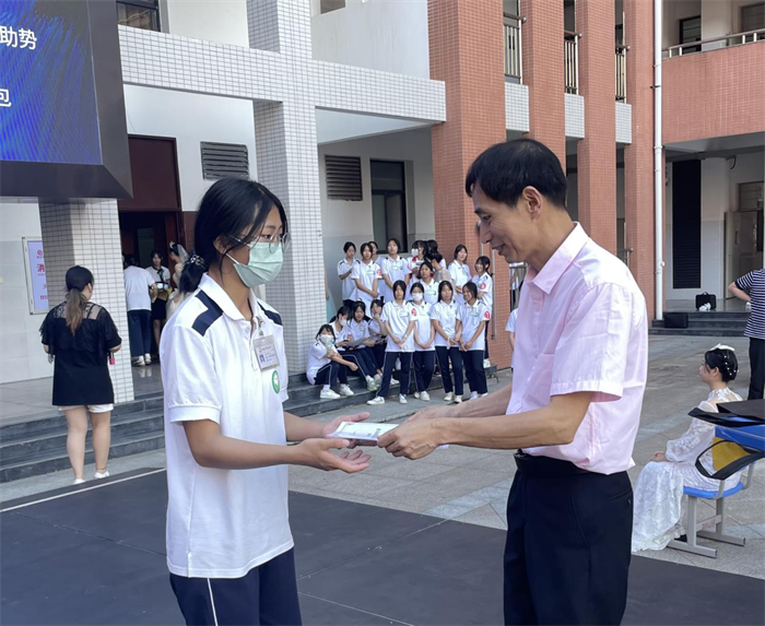 党委书记、校长罗世钦为冠军祝安琪同学颁发奖状及奖品